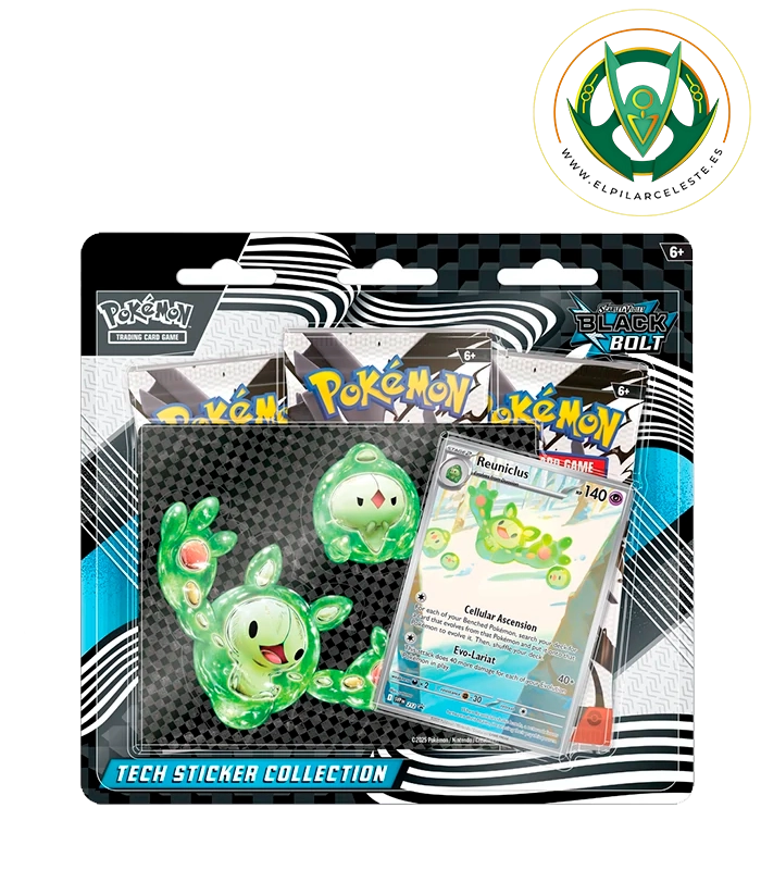 Blister Pokémon Fulgor Negro con 3 sobres de 10 cartas cada uno, hoja de pegatinas de la cadena evolutiva de Solosis y carta promocional AR de Reuniclus. Ideal para coleccionistas y fans del juego.