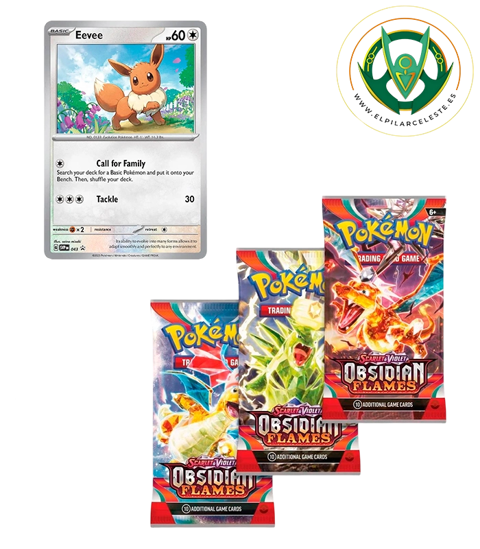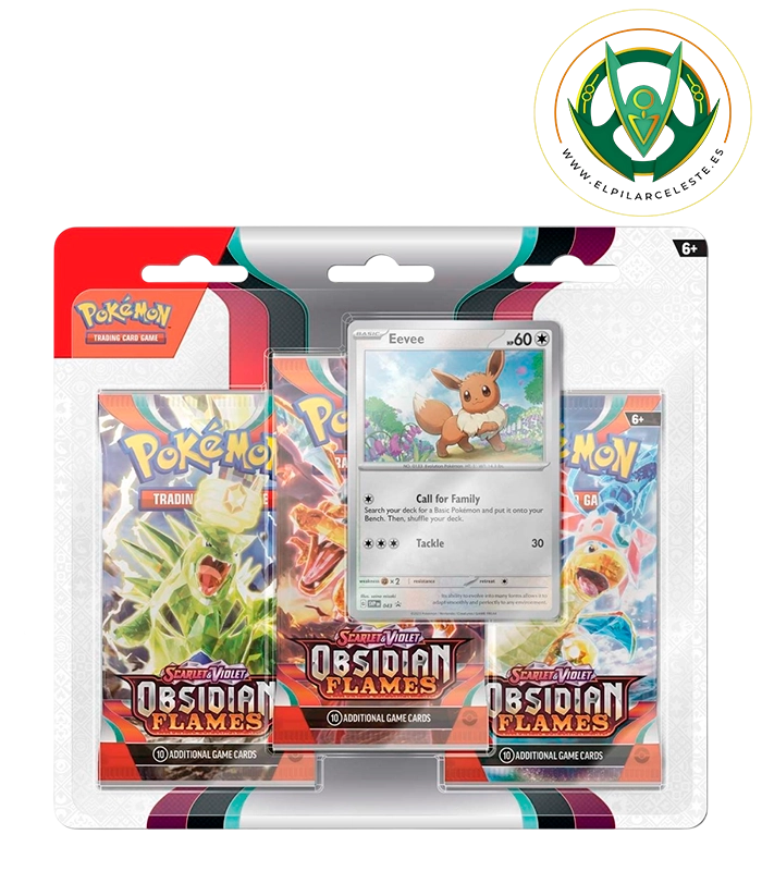 Blíster Pokémon Obsidian Flames con carta promocional de Eevee y 3 sobres. Ideal para coleccionistas y jugadores del JCC Pokémon Escarlata y Púrpura.