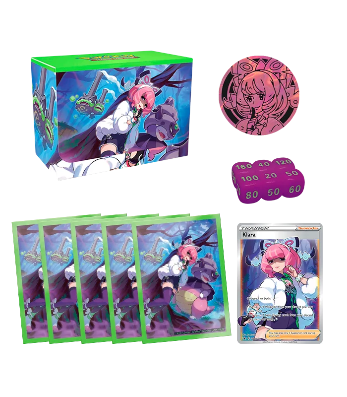 Caja Premium con 7 sobres de diferentes colecciones, 65 fundas ilustradas, cartas promocionales selladas, 1 deck box para guardar cartas, 1 moneda de Sófora, dados y fichas de juego.