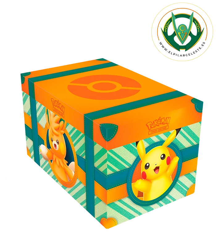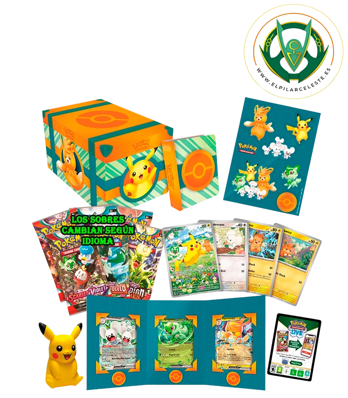Este exclusivo cofre no solo incluye cartas promocionales y sobres de expansión, sino también un adorable muñeco estrujable de Pikachu, perfecto para coleccionistas y fans de todas las edades.
