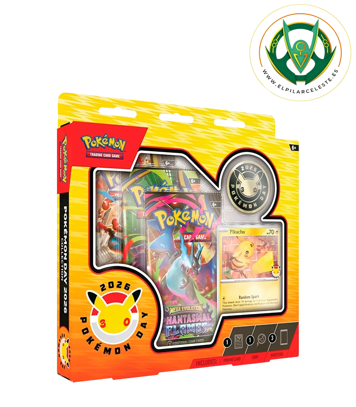 La Colección Día de Pokémon 2026 de JCC Pokémon incluye una espectacular carta holográfica promocional de Pikachu, decorada con un sello especial del Día de Pokémon, convirtiéndola en una pieza imprescindible tanto para coleccionistas como para jugadores. Además, encontrarás una moneda Pokémon exclusiva con un logotipo especial del evento, ideal para tus partidas o para exhibir junto a tu colección.