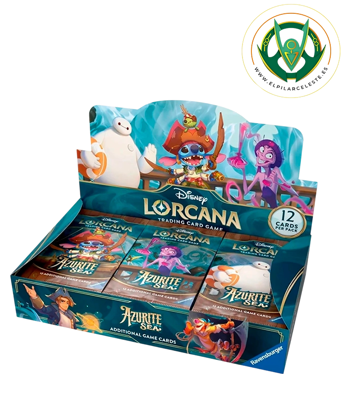 Cada sobre contiene 12 cartas aleatorias, incluyendo cartas comunes, poco comunes, raras y ultra raras, con la posibilidad de encontrar versiones especiales y foil. La colección Azurite Sea presenta ilustraciones espectaculares de personajes Disney icónicos y abre la puerta a estrategias innovadoras, aportando frescura y profundidad a cada partida.