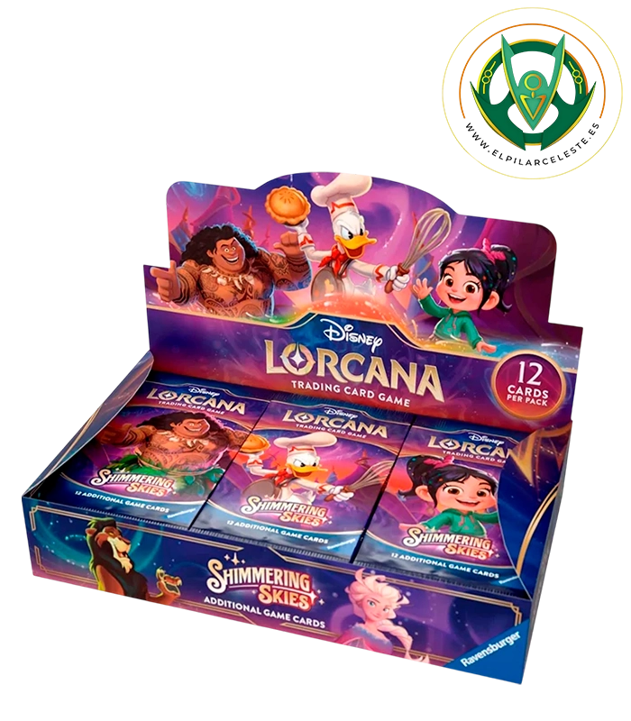 Cada sobre incluye 12 cartas aleatorias, con la posibilidad de obtener cartas comunes, poco comunes, raras, legendarias y versiones foil. Shimmering Skies introduce nuevas mecánicas y habilidades que amplían las opciones estratégicas del juego, manteniendo la compatibilidad total con todas las ediciones anteriores de Disney Lorcana.