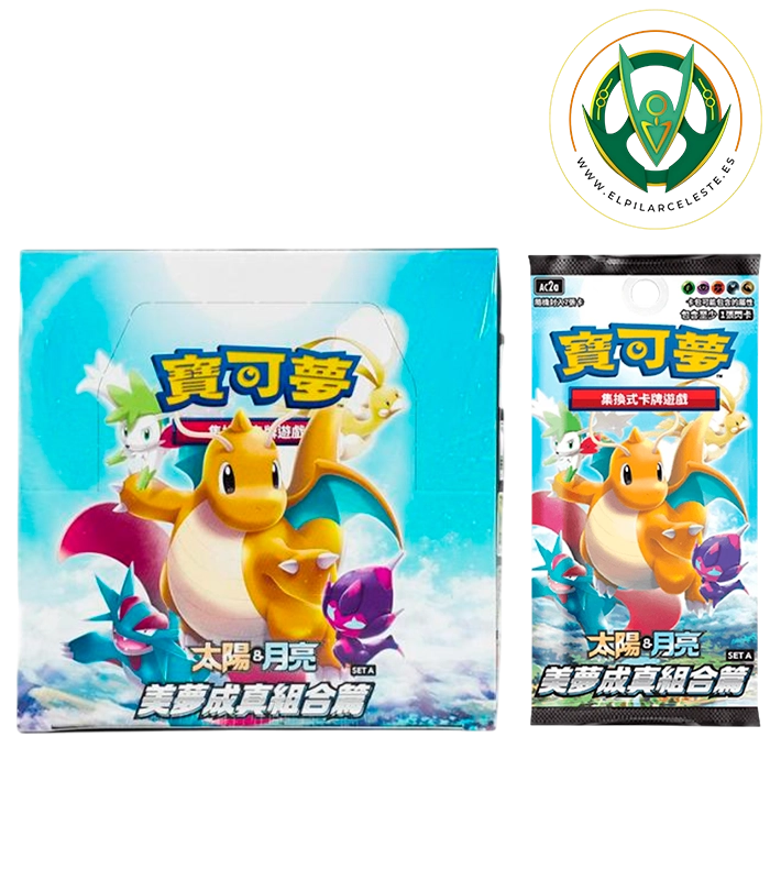 Descubre la exclusiva colección Dreams Come True, una expansión oficial en chino tradicional perteneciente a la era Sol & Luna. Esta edición destaca por su colorida presentación con Pokémon emblemáticos como Dragonite, Shaymin, Salamence y Sneasel, convirtiéndola en una pieza muy buscada por coleccionistas y fans de Pokémon en Asia.