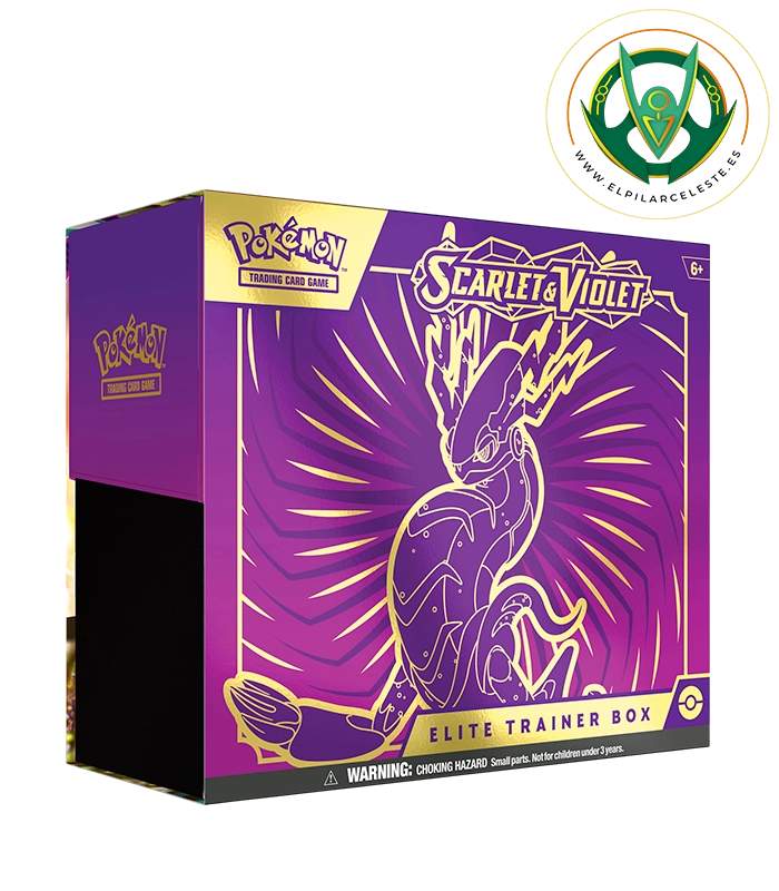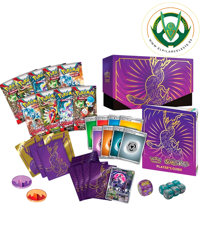Descubre la ETB de Pokémon Escarlata y Púrpura con 9 sobres, carta promocional, fundas ilustradas, separadores, energías, dados y guía de juego. Perfecta para crear un mazo competitivo y completar tu colección Pokémon.