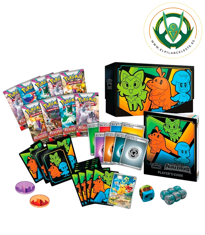 Caja de Entrenador Élite Pokémon Evoluciones en Paldea con 9 sobres, carta promo de Pikachu, fundas, energías y accesorios oficiales del JCC Pokémon.