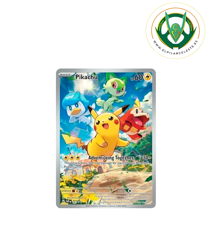 Como protagonista, encontrarás una carta promocional holográfica con ilustración expandida de Pikachu, acompañado por los adorables primeros compañeros de la región de Paldea: Sprigatito, Fuecoco y Quaxly. Su ataque especial Juntos de Aventura recompensa el trabajo en equipo, infligiendo daño adicional por cada Pokémon en Banca, ideal para estrategias dinámicas y equilibradas.