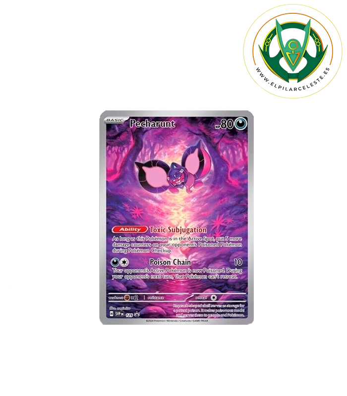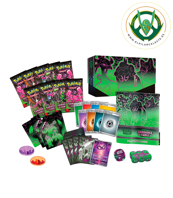 La caja incluye 9 paquetes de mejora de Escarlata y Púrpura – Fábula Sombría, ideales para descubrir nuevos Pokémon y cartas Entrenador, además de una carta holográfica de promoción con ilustración expandida de Pecharunt, perfecta para el juego y el coleccionismo. También incorpora 65 fundas exclusivas de Okidogi, Munkidori y Fezandipiti, 45 cartas de Energía, dados de contadores de daño, marcadores de condición, un dado para lanzamiento de moneda válido en torneos, y una guía para jugadores con información clave sobre la expansión.