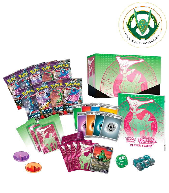 Caja de Entrenador Élite Fuerzas Temporales de JCC Pokémon con 9 sobres, carta promo exclusiva, fundas, energías y accesorios oficiales. Ideal para jugar y coleccionar.