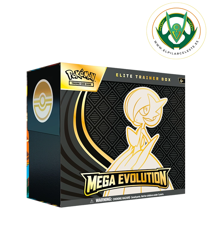 Descubre la ETB Megaevolución de Pokémon TCG: incluye 9 sobres, carta promo exclusiva, fundas ilustradas, energías, dados y accesorios para jugar y coleccionar.