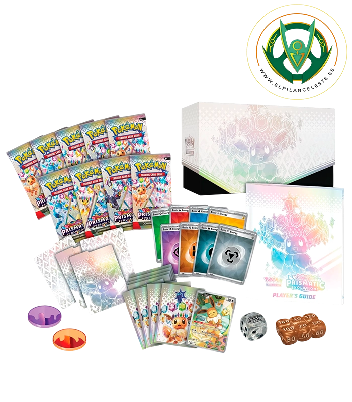 Descubre la Elite Trainer Box Prismatic Evolutions de JCC Pokémon con Eevee. Incluye 9 sobres, carta promo holográfica, fundas exclusivas y accesorios.