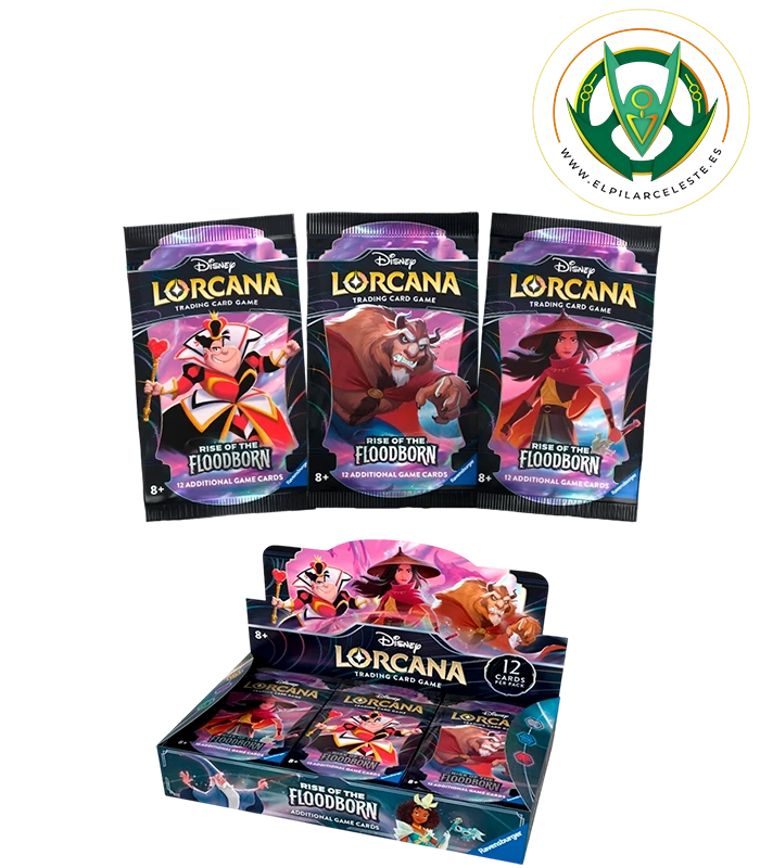 Cada sobre contiene 12 cartas aleatorias, incluyendo cartas comunes, poco comunes, raras y superiores, con la posibilidad de encontrar cartas foil y ediciones especiales. Rise of the Floodborn introduce versiones alternativas de personajes Disney, nuevas sinergias y más profundidad estratégica, ofreciendo partidas dinámicas y emocionantes.