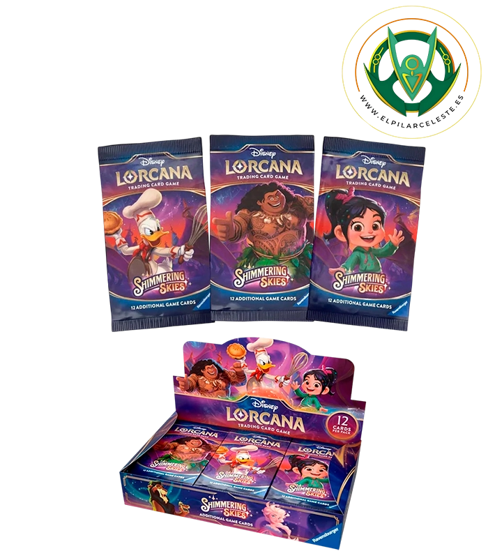 Cada sobre incluye 12 cartas aleatorias, con la posibilidad de obtener cartas comunes, poco comunes, raras, legendarias y versiones foil. Shimmering Skies introduce nuevas mecánicas y habilidades que amplían las opciones estratégicas del juego, manteniendo la compatibilidad total con todas las ediciones anteriores de Disney Lorcana.
