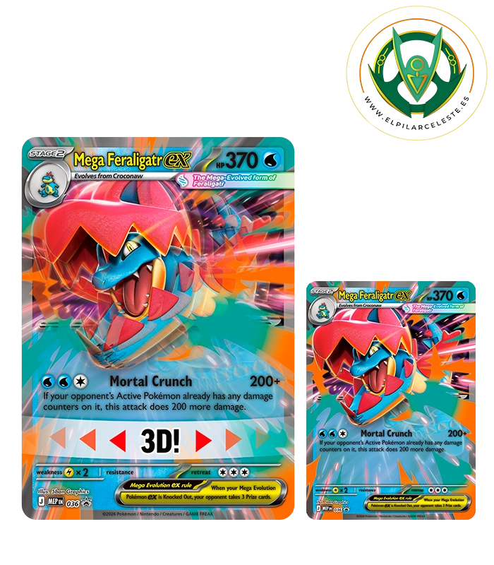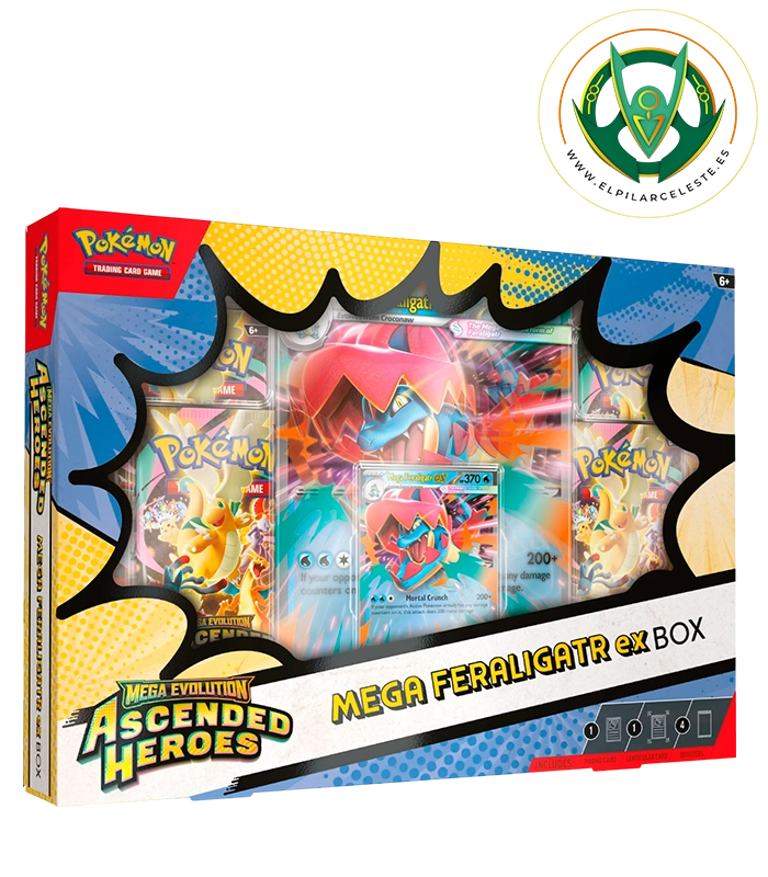 La Colección Mega-Meganium ex, Mega-Emboar ex o Mega-Feraligatr ex de Megaevolución-Héroes Ascendentes de JCC Pokémon celebra el poder de la Megaevolución y el vínculo entre Entrenador y Pokémon. Cada colección incluye una potente carta holográfica de promoción de Mega-Meganium ex, Mega-Emboar ex o Mega-Feraligatr ex lista para jugar, junto a una espectacular carta jumbo con efecto 3D y dinámicas ilustraciones. Además, incorpora cuatro sobres de mejora de la expansión Megaevolución-Héroes Ascendentes, ideales para ampliar tu colección y reforzar tus estrategias en combate. Un producto imprescindible tanto para coleccionistas como para jugadores.