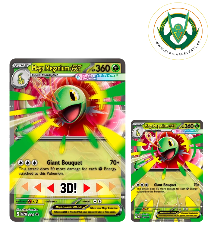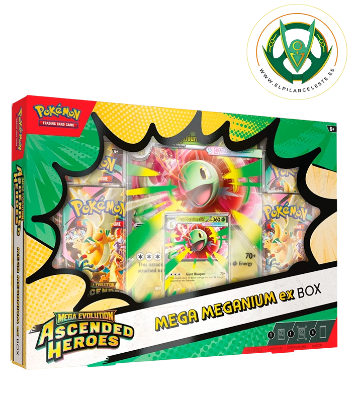 La Colección Mega-Meganium ex, Mega-Emboar ex o Mega-Feraligatr ex de Megaevolución-Héroes Ascendentes de JCC Pokémon celebra el poder de la Megaevolución y el vínculo entre Entrenador y Pokémon. Cada colección incluye una potente carta holográfica de promoción de Mega-Meganium ex, Mega-Emboar ex o Mega-Feraligatr ex lista para jugar, junto a una espectacular carta jumbo con efecto 3D y dinámicas ilustraciones. Además, incorpora cuatro sobres de mejora de la expansión Megaevolución-Héroes Ascendentes, ideales para ampliar tu colección y reforzar tus estrategias en combate. Un producto imprescindible tanto para coleccionistas como para jugadores.