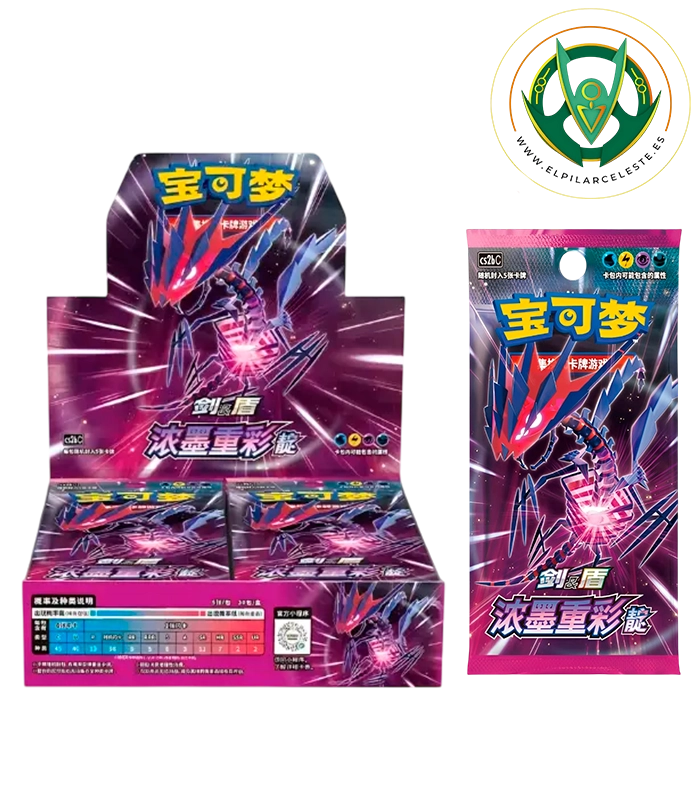 Las booster chinas de 30 sobres garantizan un número determinado de holográficas, cartas V, VMAX y una carta SR ó SAR. Esta colección también garantiza Pokémon Shiny.