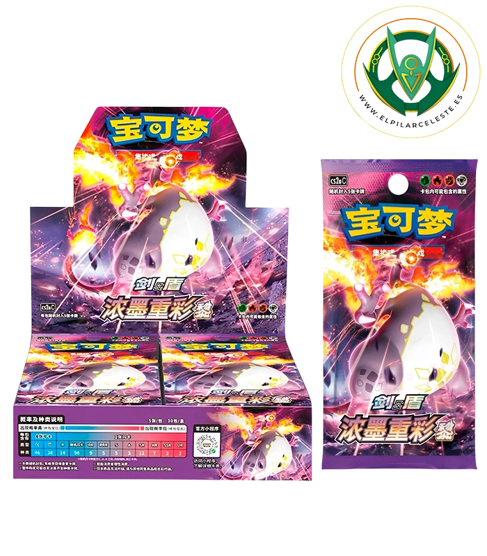 Las booster chinas de 30 sobres garantizan un número determinado de holográficas, cartas V, VMAX y una carta SR ó SAR. Esta colección también garantiza Pokémon Shiny.