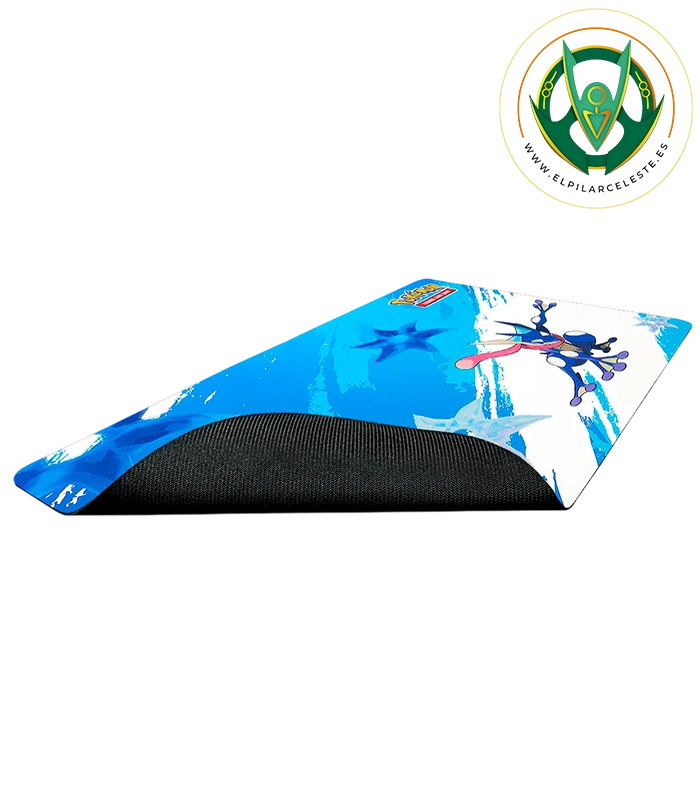 Disfruta de tus partidas con estilo con el tapete Pokémon Greninja, una alfombrilla de juego oficial con ilustraciones vibrantes a todo color. Fabricada con tejido suave en la parte superior para proteger tus cartas de arañazos y una base de goma antideslizante que garantiza estabilidad durante cada partida.