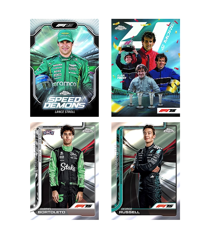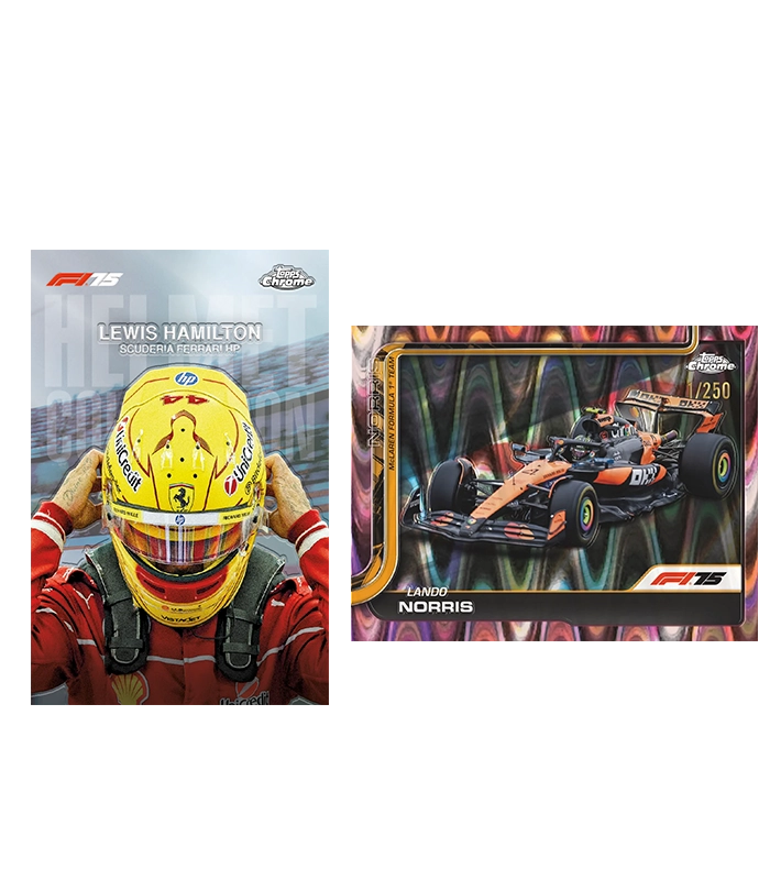 La colección incluye un set base de 200 cartas, con pilotos, monoplazas de F1®, F1® Duo Cards y cartas con el logo oficial de los equipos, todas con el espectacular acabado Topps Chrome que realza cada detalle.
