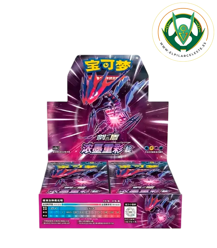 Las booster chinas de 30 sobres garantizan un número determinado de holográficas, cartas V, VMAX y una carta SR ó SAR. Esta colección también garantiza Pokémon Shiny.